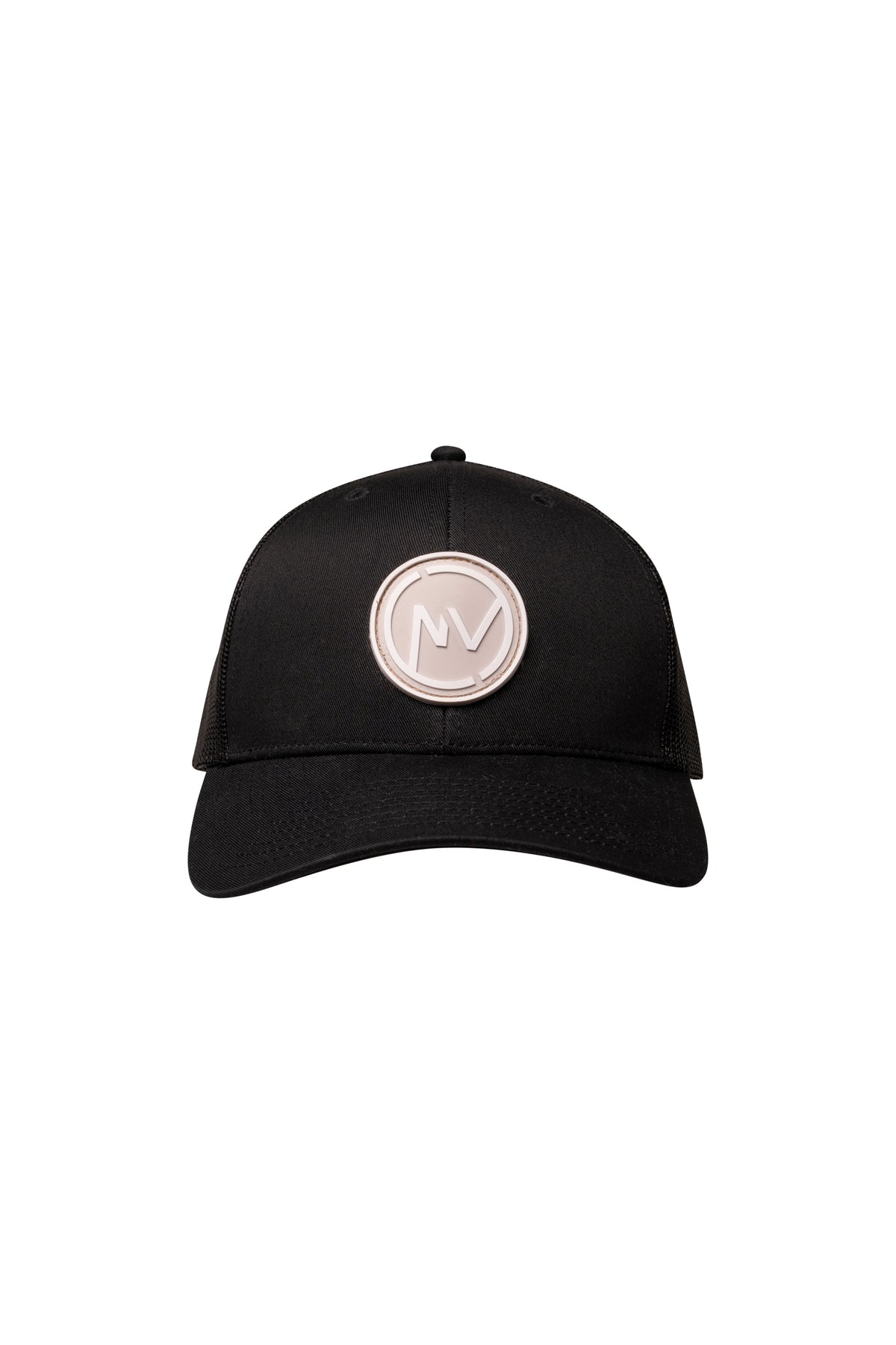 A high-profile snapback cap with a shallow curved peak, tonal mesh back and under-peak lining, with PVC patch. One size fits all.